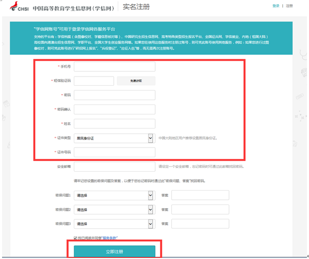注冊(cè)頁(yè)面:只需填寫紅框里的內(nèi)容,必須用學(xué)生本人手機(jī)號(hào)。