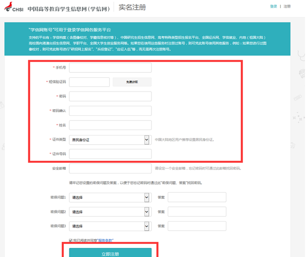 注冊(cè)頁(yè)面:只需填寫(xiě)紅框里的內(nèi)容,建議用學(xué)生本人手機(jī)號(hào)。