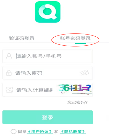 2、選擇賬號密碼登錄(注意第一次登陸必須用賬號密碼登錄,登錄后綁定手機(jī)號,綁 定手機(jī)號之后可以選擇驗(yàn)證碼登錄)