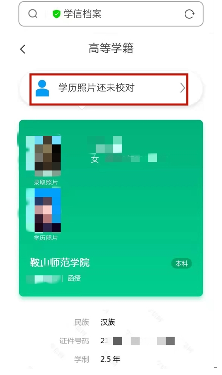 確認(rèn)無(wú)誤后,點(diǎn)擊 學(xué)歷照片還未校對(duì)。